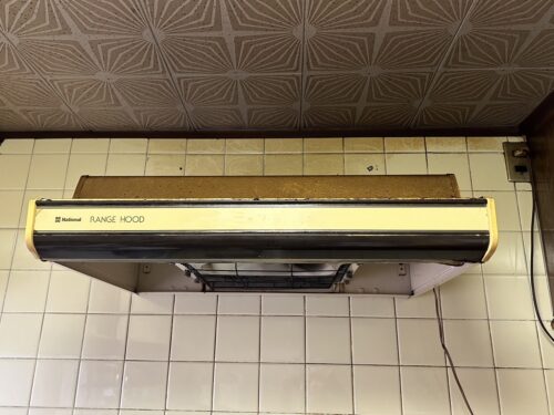 20年間にわたりアパートのキッチンを支えてきたナショナル製のレンジフードです。経年劣化により異音が発生し、最終的にはスイッチを入れても全く反応しない状態となっていました。周囲のタイルを傷つけないよう、慎重に既存の本体を取り外していきます。
