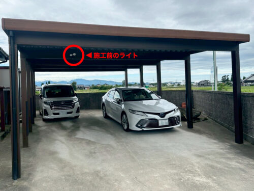 しかし、「夜間に車を降りる際、足元が暗すぎて不安」「1台だけだと光が届かない死角が多い」というお悩みを抱えておられました。実際に現地を調査させていただくと、確かに広大なカーポートに対してライトの光量が圧倒的に不足しており、防犯面でも大きなリスクを抱えている状態でした。