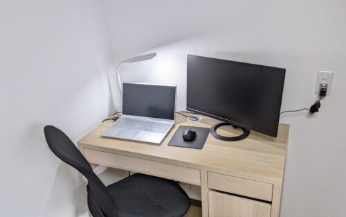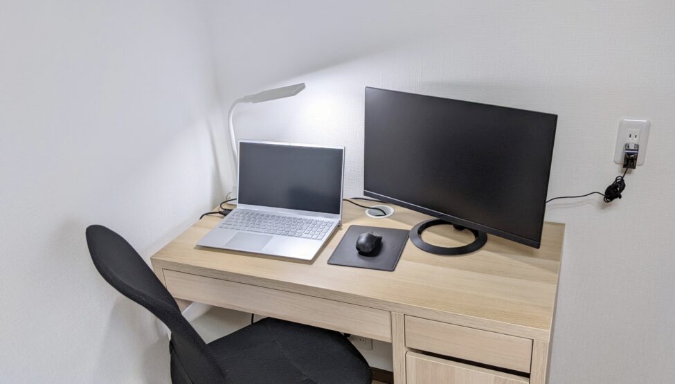 施工後の写真では、増設されたコンセントから書斎の机上にあるPCへ直接電源が供給されている様子をご覧いただけます。延長コードが不要になり、足元もすっきりとした安全な作業環境が実現しました。電源の位置が適正化されたことで、今後周辺機器を追加する際も安心です。